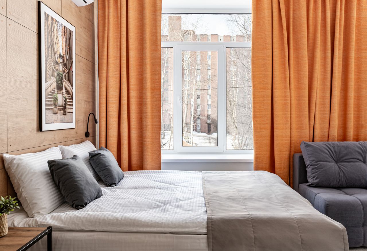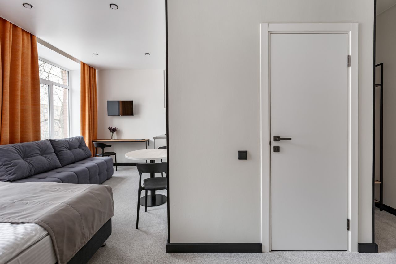 Bright stylish studio offers an accommodation for 2-4 guests. Room size is 18 sq.m, capacity of room: up to 4 guests. This type of room has a double bed (or two twin beds) and a couch, which, if necessary, can turn into a bed as well. Guests also can use here free WI-FI, TV-set, private bathroom (shower and toilet) and a small kitchen area with all facilities for cooking.